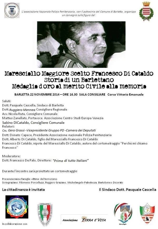 La manifestazione, che si svolgerà presso la Sala del Consiglio Comunale alle ore 16,30 è intitolata “Storia di un barlettano medaglia d’oro al merito civile alla memoria” e vedrà la partecipazione di Pasquale Cascella, sindaco di Barletta; Ruggiero Mennea, consigliere regionale; Nicola Ruta, consigliere comunale; Matteo Zanellato, portavoce del Centro Studi Europa; Gero Grassi, vicecapogruppo Pd alla Camera; Donato Capece, Presidente Associazione Nazionale Polizia Penitenziaria; Alberto Di Cataldo, figlio del Maresciallo; Francesco Di Cataldo, nipote e autore del cortometraggio “Perché mi chiamo Francesco“. Modera il giornalista Francesco De Palo, Direttore di “Prima di tutto Italiani“ e addetto stampa del Ctim.