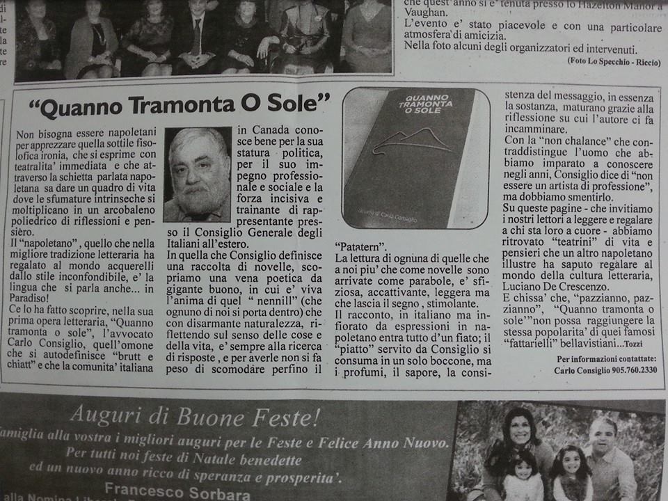 “Quanno tramonta ‘o sole “ è il titolo del libro di Carlo Consiglio, presentato nel corso dell’evento del Ctim a Toronto lo scorso fine settimana. Novelle, storie di vita, buoni sentimenti , umanità e sagacia partenopea in 200 pagine da leggere tutte d’un fiato, per godersi un San Pietro che parla napoletano in Paradiso e la teoria della maggior quantità di fosforo nel cervello che i napoletani avrebbero ereditato dalle sabbie vulcaniche del Vesuvio. Ecco a seguito le recensioni pubblicate dai giornali iotalocanadesi “LO Specchio” e “Corriere canadese”.