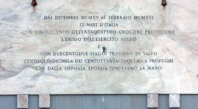 “Dal dicembre 1915 al febbraio 1916 – le navi d’Italia – con cinquecento ottantaquattro crociere protessero l’esodo dell’Esercito serbo e, con duecento due viaggi trassero in salvo centoquindicimila dei centosettantacinque mila profughi che dall’opposta sponda tendevano la mano”: questa targa campeggia nel porto di Brindisi per ricordare l’opera compiuta dalle navi italiane.