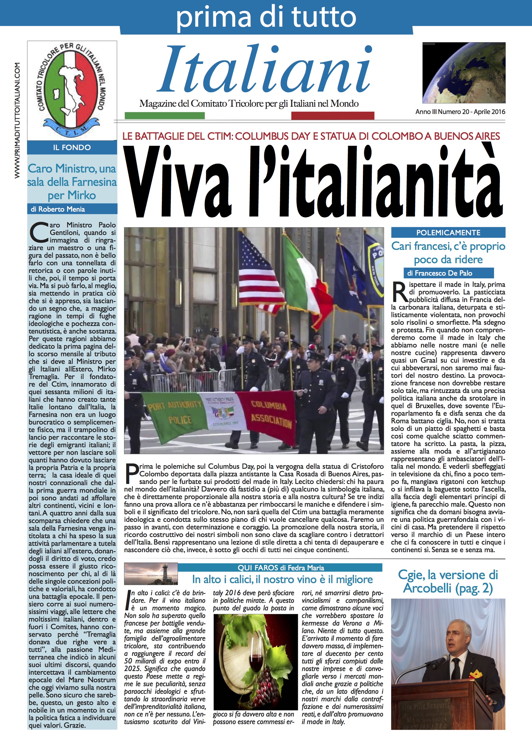 Chi ha paura dell’italianità? Prima le polemiche sul Columbus Day, poi la vergogna della statua di Colombo deportata dalla piazza antistante la Casa Rosada di Buenos Aires, passando per le furbate sui prodotti del made in Italy. Chi ha paura nel mondo dell’italianità? Apre così il nuovo numero di Prima di Tutto Italiani, con riferimento alle due battaglie che il Ctim si accinge ad affrontare.