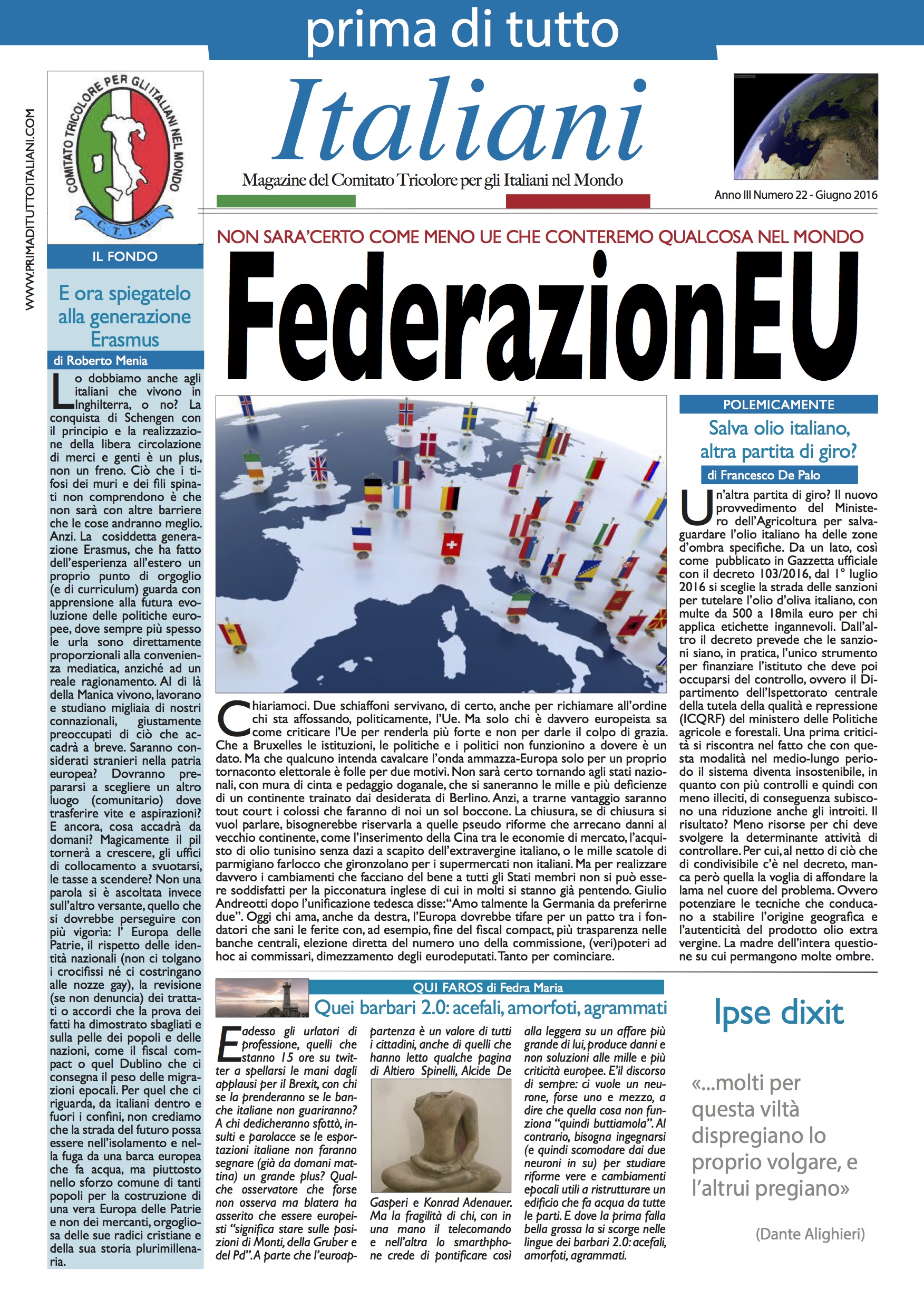 Chiariamoci. Due schiaffoni servivano, di certo, anche per richiamare all’ordine chi sta affossando, politicamente, l’Ue. Ma solo chi è davvero europeista sa come criticare l’Ueper renderla più forte e non per darle il colpo di grazia. FederazionEu è il titolo scelto per il nuovo numero di Prima di Tutto Italiani(scaricalo qui) dopo il referendum inglese sul Brexit.
