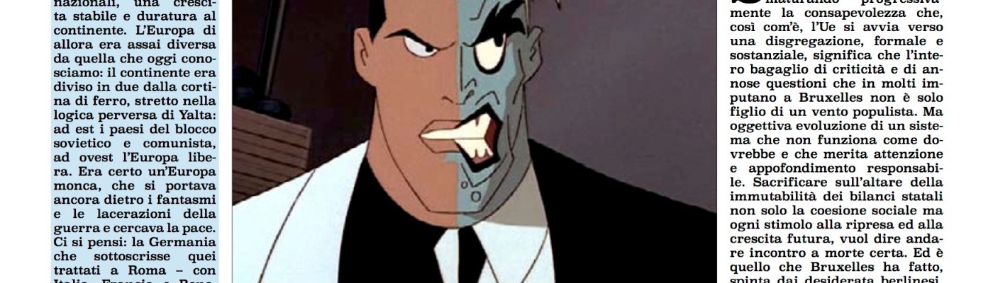 Madre o matrigna? L’Unione Europea vive mesi complicati, – si legge nel fondino di apertura – non solo dal punto di vista finanziario ma soprattutto da quello sociale e politico. Abbiamo scelto per questo la metafora del personaggio presente nella saga di Batman, Due facce, perché con un pizzico di ironia, può aiutarci a capire e riflettere, prima di formarsi un’opinione. Che a Bruxelles qualcosa non funzioni a dovere è cosa evidente.