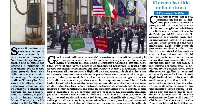 Anziché accanirsi sui simboli del passato, – si legge nel fondino di apertura – la politica pensi a costruire il futuro, se ne è capace. La querelle relativa ai simboli di Italo Balbo e Cristoforo Colombo, oggetto negli Stati Uniti di una vera e propria campagna ad personam, è frutto della becera ideologia revisionista che non rispetta storie e dinamiche. Siamo in presenza di una strategia figlia di una esasperata ideologia che, oltre che assolutamente anacronistica e pericolosamente puerile, si arroga il potere di decidere su simboli e riconoscimenti che appartengono alla storia italiana e non alla partitocrazia.