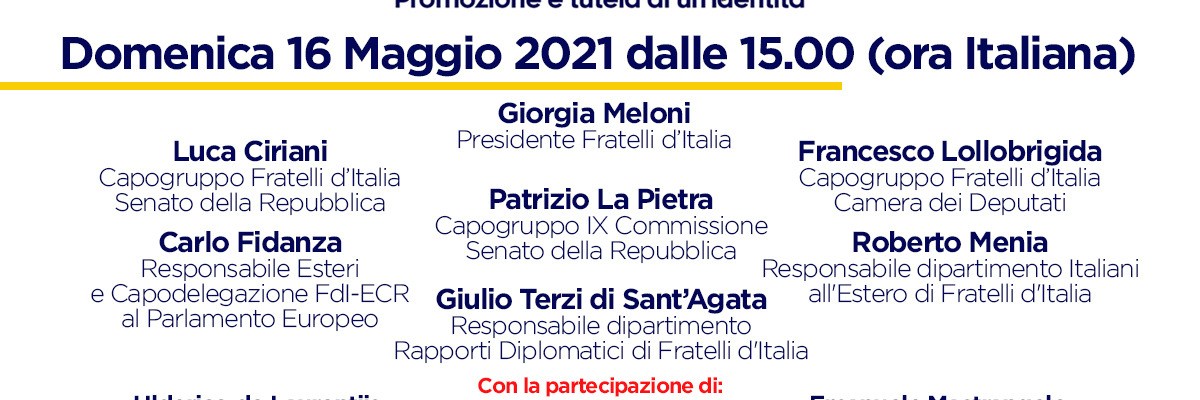 “#italiaoltreconfini. Promozione e tutela di una Identità” è l’iniziativa organizzata dal gruppo al Senato di Fratelli d’Italia che si svolgerà sabato 15 e domenica 16 maggio dalle ore 15 in diretta streaming sul canale Facebook di FdI Senato, dedicata alle comunità dei nostri connazionali in Nord America e Sud America.
