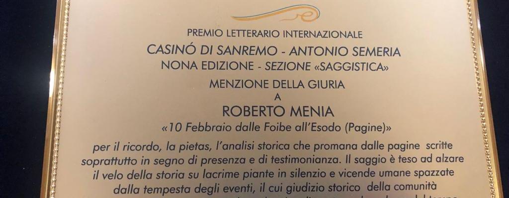 Il neosenatore Roberto Menia, Segretario Generale del CTIM e padre della legge che ha istituito il Giorno del Ricordo, ha ricevuto oggi la Menzione della Giuria in occasione della consegna dei ‘Trofei’ del Premio Letterario Internazionale Casinò di Sanremo Semeria per il suo libro “10 febbraio, dalle Foibe all’esodo”.