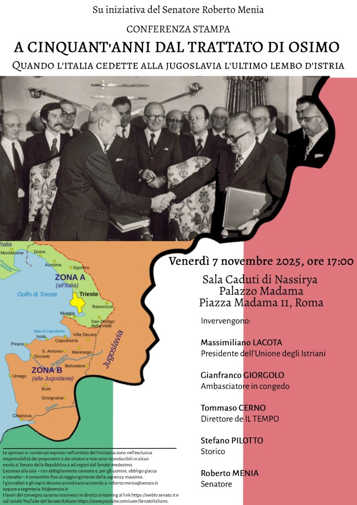 Il prossimo 7 novembre, alle ore 17, infatti, su iniziativa del senatore di Fdi Roberto Menia, si svolgerà una tavola rotonda in Senato nella Sala Caduti di Nassirya con l’obiettivo di raccontare quel curvone della storia e le relative conseguenze, nazionali ed internazionali, politiche, sociali, culturali oltre che umane. Assieme al senatore triestino, “padre” della Legge istitutiva del 10 febbraio, interverranno il Presidente dell’Unione degli Istriani Massimo Lacota, l’Ambasciatore in congedo Gianfranco Giorgolo, il Direttore del Tempo Tommaso Cerno, lo storico Stefano Pilotto.